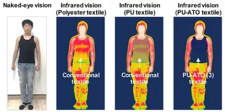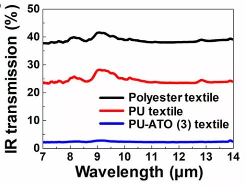 韓國京畿道大學Sang-Mi Jeong等研究人員成功合成了聚氨酯-銻錫氧化物(PU-ATO)復合纖維,與常規的聚酯或PU織物相比,本研究開發的PU-ATO復合纖維紡織品具有出色的IR和熱輻射屏蔽性能,即使暴露于?20°C和+80°C的重復溫度變化以及30天的長期溫度變化的十個循環中,制成的PU–ATO復合纖維仍具有穩定的IR和熱輻射屏蔽性能。PU-ATO復合纖維的表面被制成疏水性,以防止由于PU-ATO復合纖維被吸收的水潤濕而導致IR和熱輻射變形。