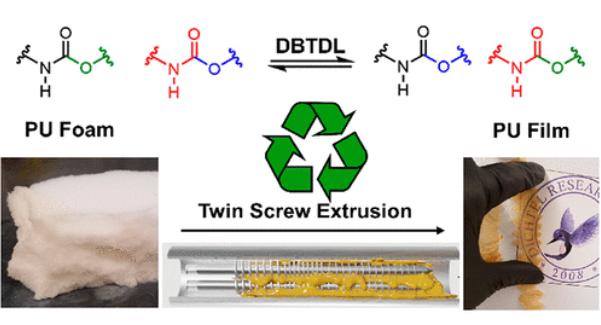 最后,研究人員將此方法應用于從消費品中提取的PU泡沫,并設想該方法可用于處理每年產生的大量PU廢料,研究人員購買了商用PU泡沫塑料,并使用DBTDL催化劑進行微混合和擠出處理。