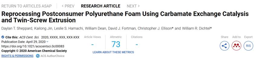 近期,西北大學的William R. Dichtel教授將二月桂酸二丁基錫(DBTDL)引入交聯的PU泡沫中,通過動態氨基甲酸酯交換反應使泡沫具有可塑性,然后使用雙螺桿擠出機去除泡沫中的空氣,形成一種比原PU泡沫價值更高的材料,這種材料具有較強重塑性,可加工成堅硬耐用的塑料或柔軟彈性的薄膜,用于汽車保險杠、表帶、購物車或滑板輪等產品。這項技術將使商用PU廢料進一步回收利用,并推動其他熱固性材料再處理的進一步發展!