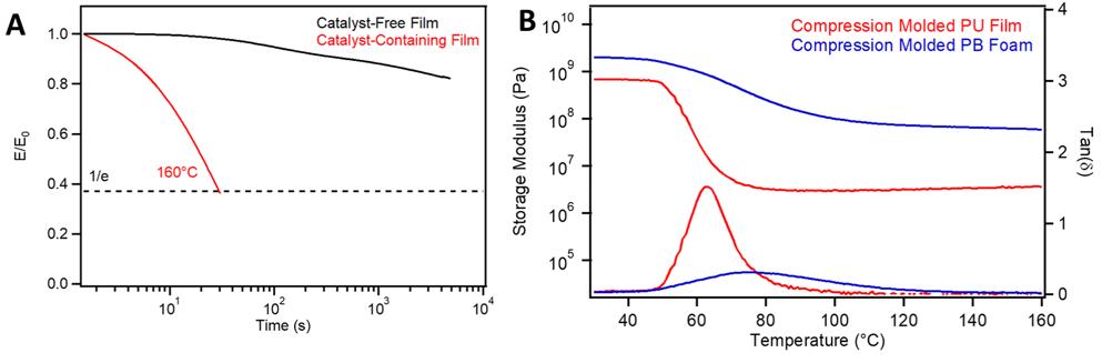 為了確定DBTDL的添加在PU處理中的作用,研究人員使用無催化劑的PU膜進行了對比測試。圖2的應力松弛分析結果顯示,經DBTDL催化劑處理得到的薄膜可迅速恢復應力,在處理過程中會經歷快速的動態轉換;而無催化劑的薄膜松弛應力要慢得多,并且顯示出較差的可再加工性,表明DBTDL催化劑的使用促進了PU泡沫的再處理。