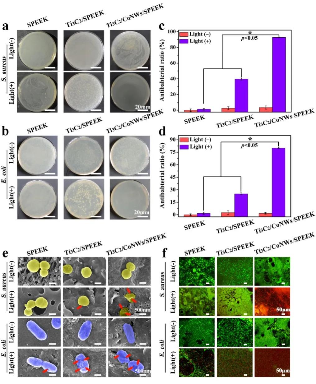 Ti3C2/CoNWs涂層在近紅外光觸發下產生的光熱和光動力學效應可以在20分鐘內對革蘭氏陽性金葡萄球菌/革蘭氏陰性大腸桿菌就行殺滅,達到90%以上的抗菌效果(圖2)。此外,體外細胞實驗結果表明異質結具有較好的細胞相容性。綜上所述,該新型MXene/CoNWs生物異質結涂層賦予了PEEK植入體優異的雙重光熱/光動力協同抗菌特效,大大拓寬了PEEK植入體在感染性骨缺損修復領域的臨床應用,避免了抗生素耐藥菌的科學難題。